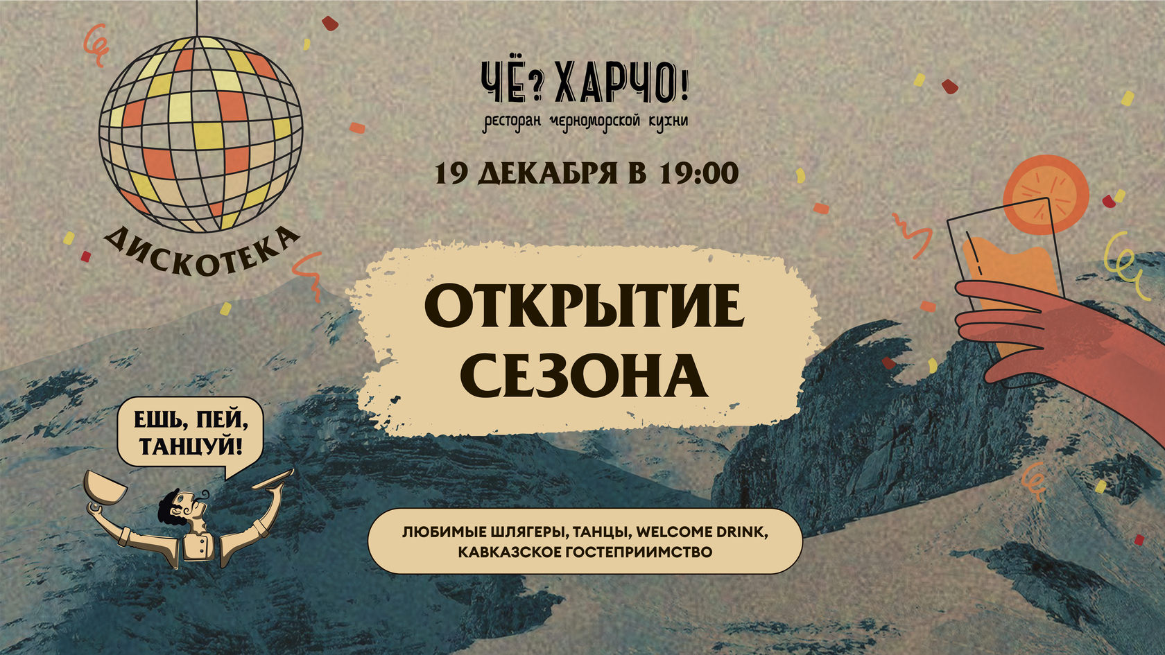 19 декабря в 19:00 ресторан «Че?Харчо!» торжественно открывает горнолыжный сезон — с душой, вкусом и безудержным весельем!